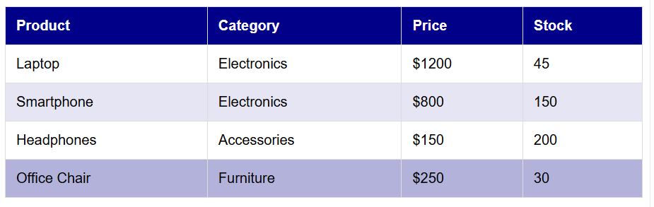 Data tables are essential for displaying large sets of structured information like product catalogs, sales reports, schedules, and statistics. With HTML and CSS, you can make tables visually appealing, readable, and easy to use.