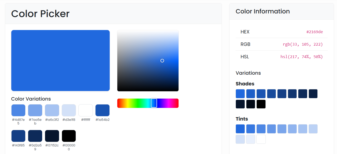Our free HTML Color Picker & Palette Generator makes it easy to find the perfect color for your projects. You can extract colors from images, copy HEX, RGB, or HSL codes, and even generate ready-to-use palettes for web design and CSS styling.