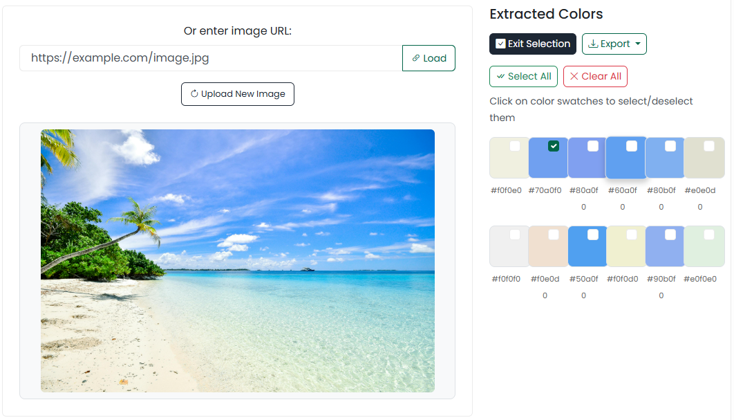 Pick colors from an image and extract all colors with variations automatically. Use the eye dropper to pick specific colors in an image or export selected colors as text or HTML.