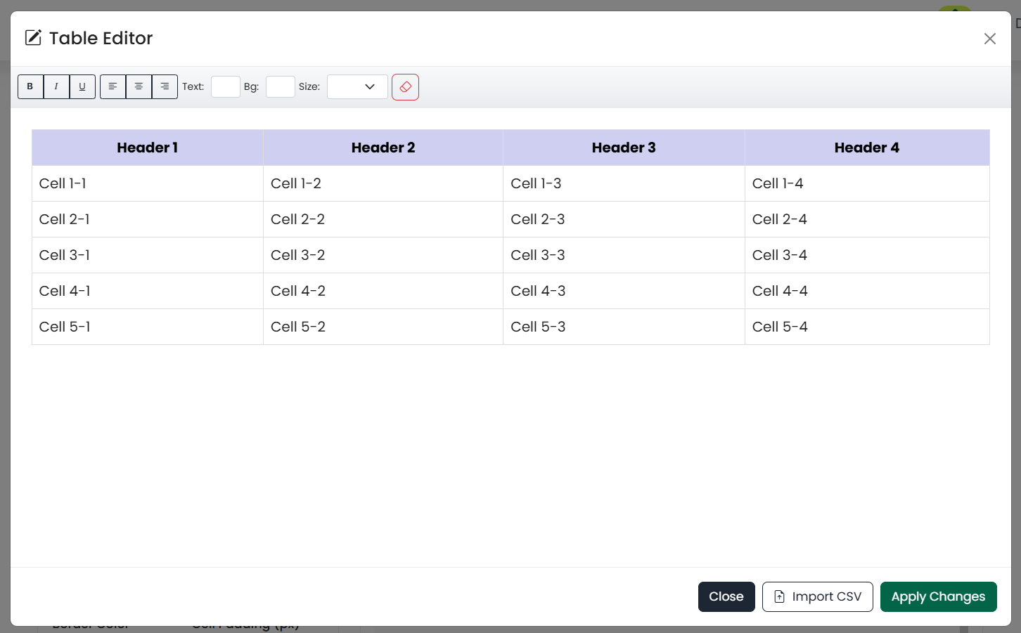 Create clean, responsive HTML tables in minutes. Adjust rows and columns, style headers and cells, import CSV, and edit content inline or in full-screen editor mode.